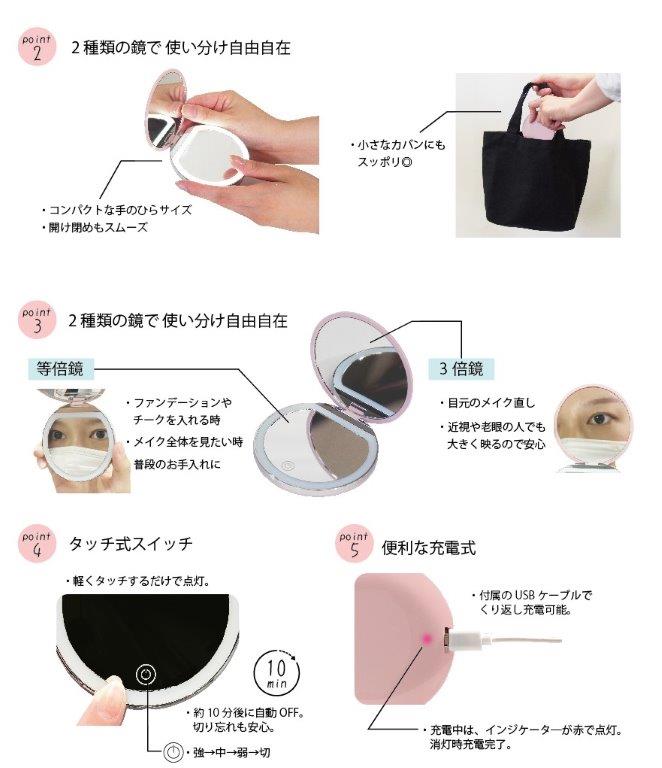 外出先でのお化粧直しにとっても便利! LEDライト付きだから暗い所でもお化粧直しができます! 等倍と3倍鏡を搭載!細部までしっかりと確認ができます USBケーブルで充電ができるのでくり返し充電して使用可能 LEDライトを消し忘れてしまっても10分後に自動でOFFになるので切り忘れても安心! 付属品:USBケーブル 200mahリチウム電池 LED種類:SMD LED 個数:32LED 充電時間:約30分 バッテリー稼働時間:約1~2時間 |