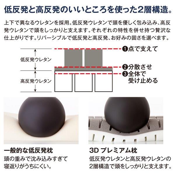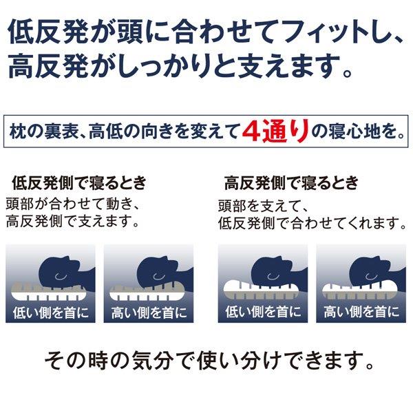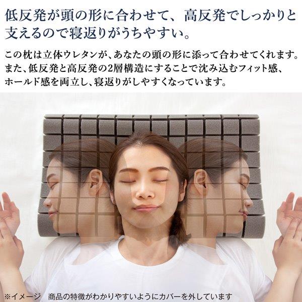 ブロック形状の立体ウレタンがあなたにフィット。 低反発+高反発 2層構造 頭の形に沿ってフィットする立体ウレタン 低反発が頭の形に合わせ、高反発でしっかりと支えるので寝返りがうちやすい。 この枕はスリットの入ったウレタン1個1個があなたに合わせて動くので、抜群のフィット感が得られます。 フィット感が得られる=リラックスした体勢となり翌朝もスッキリ。 【まるで頭が浮いたような寝心地】 3Dセルウレタンが個別に動き、どんな体勢にもフィットするので、そのつらい首・肩がスッキリ! 空気がスリットの間を流れるので頭部も快適に。 【ブロック形状の立体ウレタンがどんな寝姿勢にも合わせて動いてくれます。】 低反発が頭に合わせてフィットし、高反発がしっかりと支えます。 枕の表裏、高低の向きを変えて4通りの寝心地を。 低反発側で寝るとき:頭部が合わせて動き、高反発側で支えます。 高反発側で寝るとき:頭部を支えて、低反発側で合わせてくれます。 その時の気分で使い分けできます。 低反発と高反発のいいところを使った2層構造。 上下で異なるウレタンを採用。 低反発ウレタンで頭を優しく包み込み、高反発ウレタンで頭をしっかりと支えます。 それぞれの特性を併せ持つ贅沢な仕上がりです。 リバーシブルで低反発と高反発、お好みの固さを選べます。 点と面のいいとこどり!抜群のフィット感の立体ウレタン。 点で押すと簡単に沈み込み、面で押すと支えるので沈み込みにくい。 点と面を両立した形状で、寝返りも打ちやすい。 点でつつむ:耳などを柔らかく受け止めてくれます。 面で支える:適度な沈み込みでしっかりと支えてくれます。 枕カバーはエンボス加工 肌あたりの良いレーヨンを採用。 肌への接地面積が少なく、不快な貼り付き感がありません。 カバー抗菌 カバー防臭 カバー洗濯OK |
