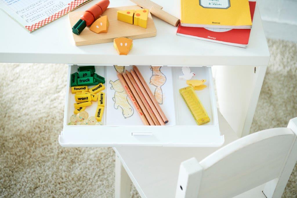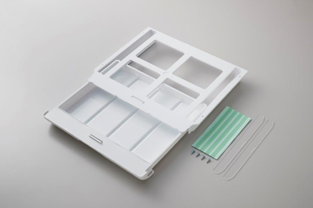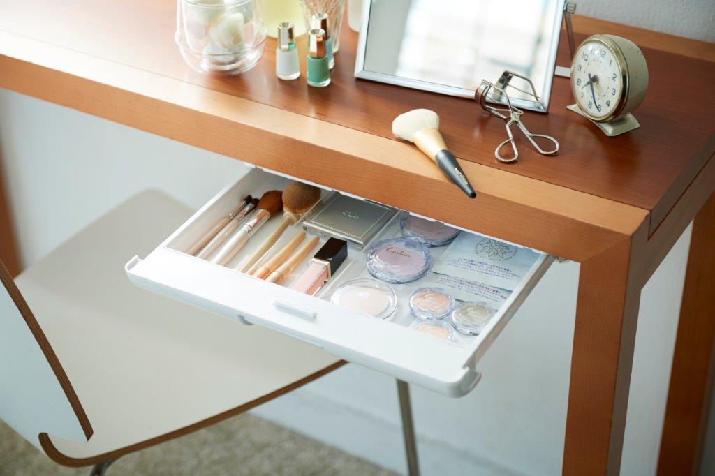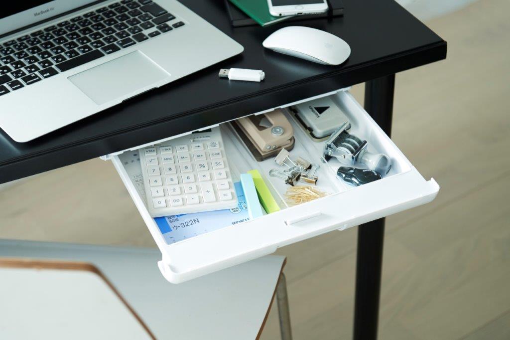 天板にピタッ!と取り付けるだけ! テーブルなどの下に”引き出し”をカンタンに取り付け (取り付け方法:両面粘着テープ、ネジ)仕切板付 |