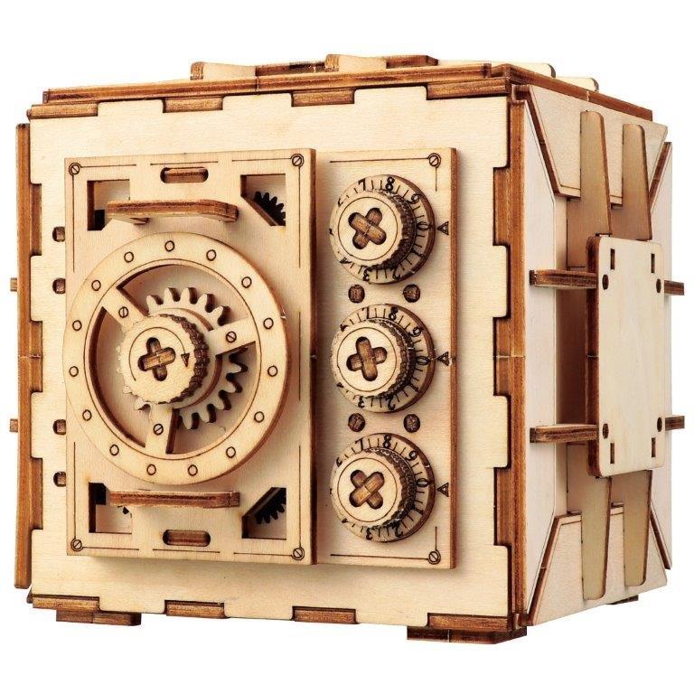 本格的なダイヤル式金庫を作ってみよう! 接着剤や工具なしで本格的なダイヤル式金庫型貯金箱が作れるキットです。 レーザーでカットされたベニヤパーツを抜いて、立体パズルのように組み立てて作りあげていきます。 3桁の暗証番号でロックできる仕組みの箱で、後ろ側にコイン投入口がついていて、貯金箱としても使えます。 |