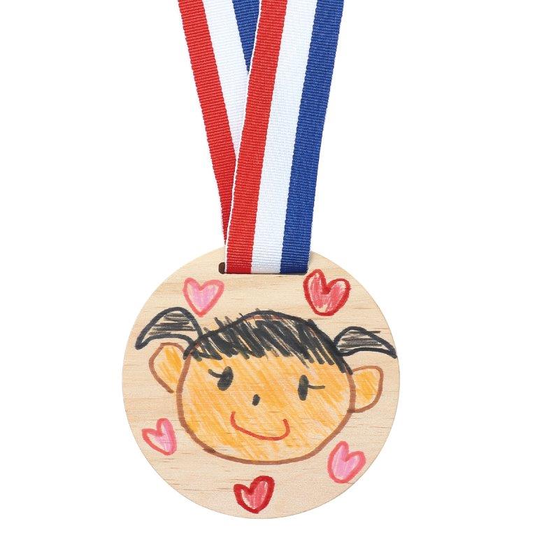 お絵描きして自分だけのメダルをつくろう! 木製のメダルです。 無着色なので、オリジナルのメダルをつくることができます。 リボン付なので、首からさげることができます。 使用可能画材:色鉛筆、油性ペン、クレヨンなど。 |