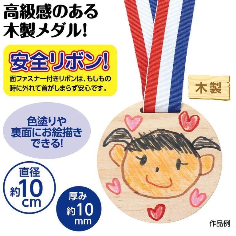 高級感あふれる木製メダルです。 かわいいイラストが焼き印されています。 裏面は無地なので自由にお絵かきも楽しめます。 子どもたちの創造力を引き出すと同時に、一生の思い出に残るアイテムに! リボンにはマジックテープが付いており、もしもの時にも首がしまらず安全に使用できる安心設計。 運動会やスポーツ大会、表彰式などのプレゼントや記念品におすすめです。 |