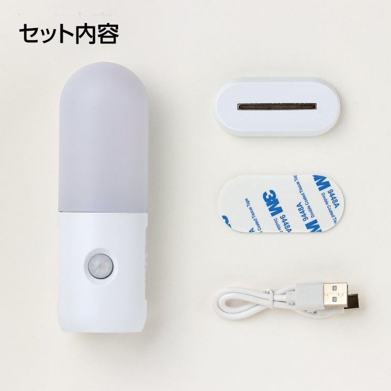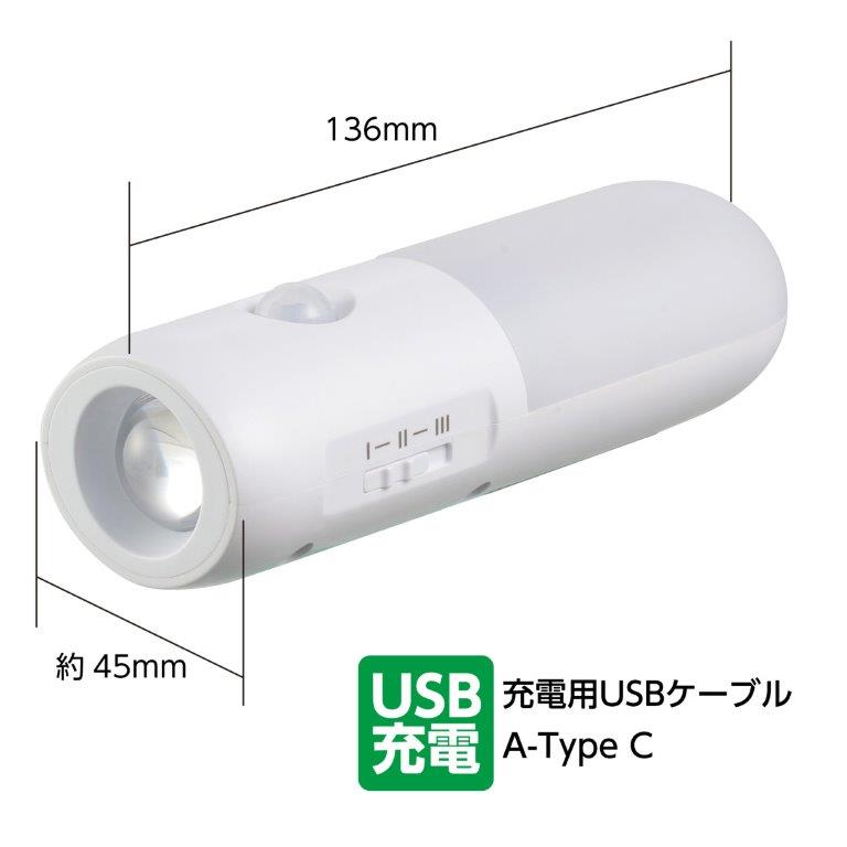 懐中電灯としてもルームライトとしても使用できる多機能ライトです。 消灯時や停電時に周囲が暗くなると、自動で点灯する「明暗センサー」と、人の動きを感知して光る「人感センサー」を搭載しています。 電球色・昼光色・昼白色の3色展開で、好みに合わせた光を選択可能です。 壁面取り付けも簡単な磁石プレート付き。 USB Type-C充電式で、約4時間の充電で、約4時間使用可能(使用モードによって異なります)。 常時点灯・常時消灯・センサーモードの3つのモードを搭載し、様々な用途に対応します。 全光束60ルーメンの明るさで、停電時や夜間の安全をサポートする防災・防犯の頼れるアイテムです。 使用電源:リチウムイオンポリマー二次電池3.7V、1200mAh。 |