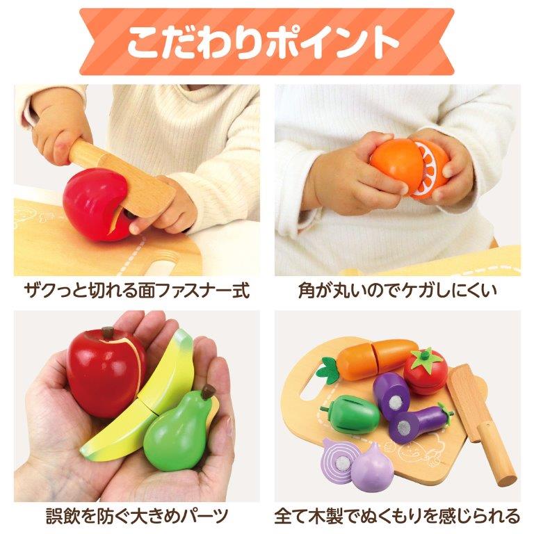 ザクザク切って楽しく遊ぼう! ラッピング袋付きでプレゼントにぴったり! ざくっと切る感覚が楽しい、かわいい果物のおままごとセットです。 りんご、バナナ、スイカ、オレンジ、洋ナシの5種類の果物が揃い、それぞれ切り口の違いを観察できる楽しさが魅力です。 面ファスナーなので繰り返し遊ぶことができます。 誤飲を防ぐ大きめのパーツで小さなお子さまにも安心。 おままごと遊びを通じて創造力や手先の器用さを育む知育玩具として、子どもたちに大人気のアイテムです。 ラッピング袋付きでギフトとしてもおすすめです。 |
