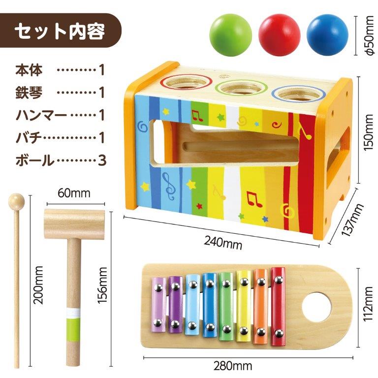 ボールを落として音色を奏でる! ラッピング袋付きでギフトにぴったり! ボールを落として音色を奏でることができる、モンテッソーリ教育に基づいたおすすめの木製玩具です。 ボール落としと鉄琴あそびの2種類の遊び方ができます。 にぎる、たたくといった動作をするので、はじめての指先知育にもおすすめです。 誤飲を防ぐ大きめのボールなので小さなお子さまにも安心。 木のやさしい質感を活かした塗装が施され、あたたかみのある木製玩具です。 ラッピング袋付きでギフトとしてもおすすめです。 |