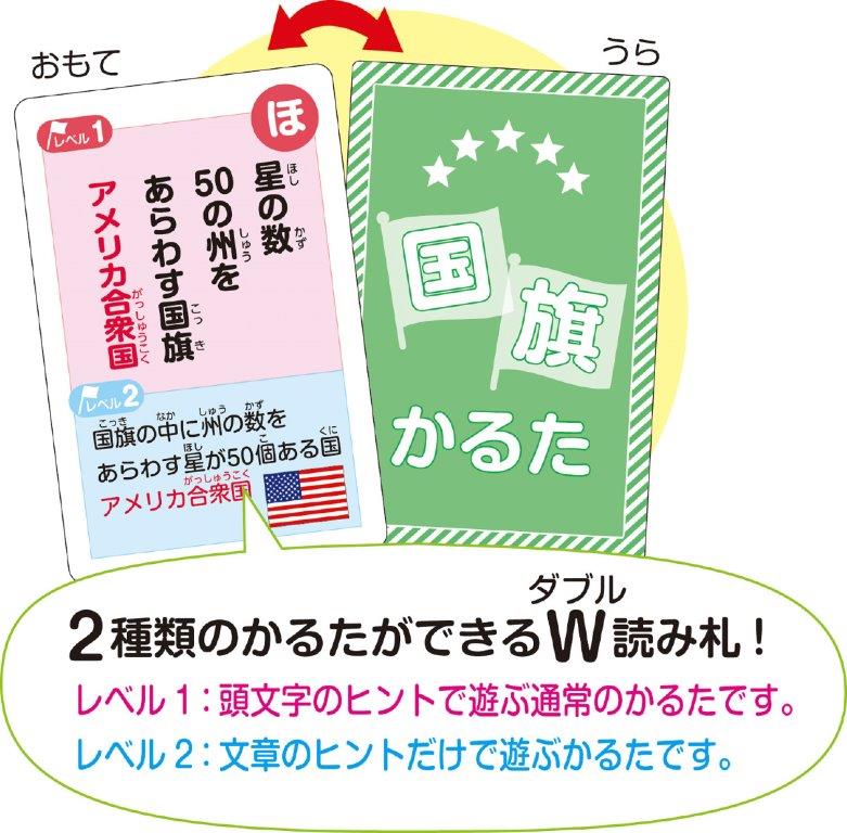 46カ国の国旗を遊びながら覚えよう! 世界中の国旗がテーマのかるたです。 取り札にたどり着くための読み札の内容が2つあり、レベルに合わせて遊ぶことができるかるたです。 レベル1:頭文字のヒントで遊ぶ通常のかるたです。 レベル2:文章のヒントだけで遊ぶかるたです。 国旗や国の名前、首都・通貨などの国の情報を覚えることができます。 |
