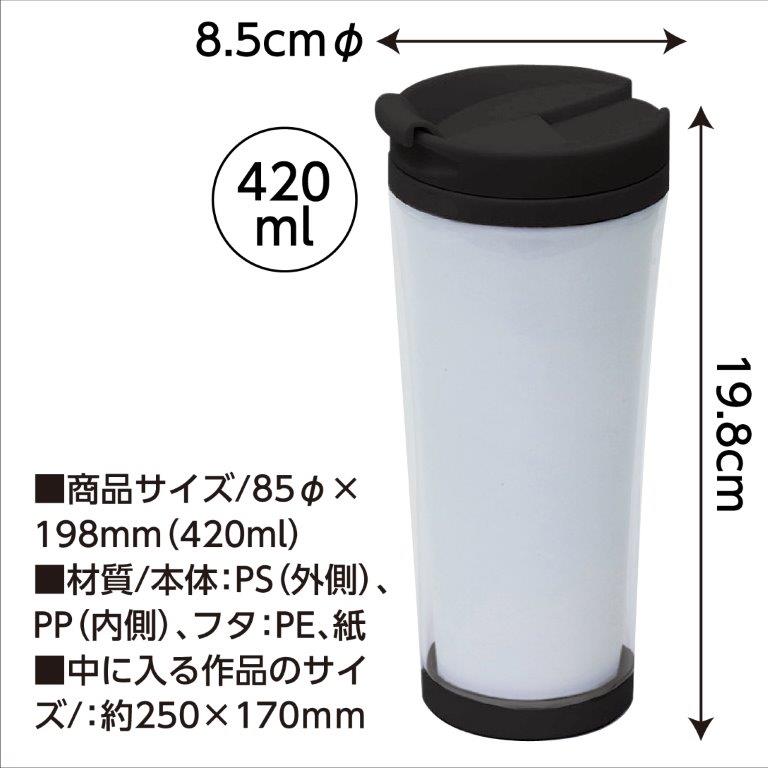 セットされている紙にデザインをして使用できるタンブラー! 好きなイラストがかける台紙付! 水彩絵の具・ポスターカラー・アクリルガッシュ・墨・ペンなど、さまざまな画材で描くことができます。 |