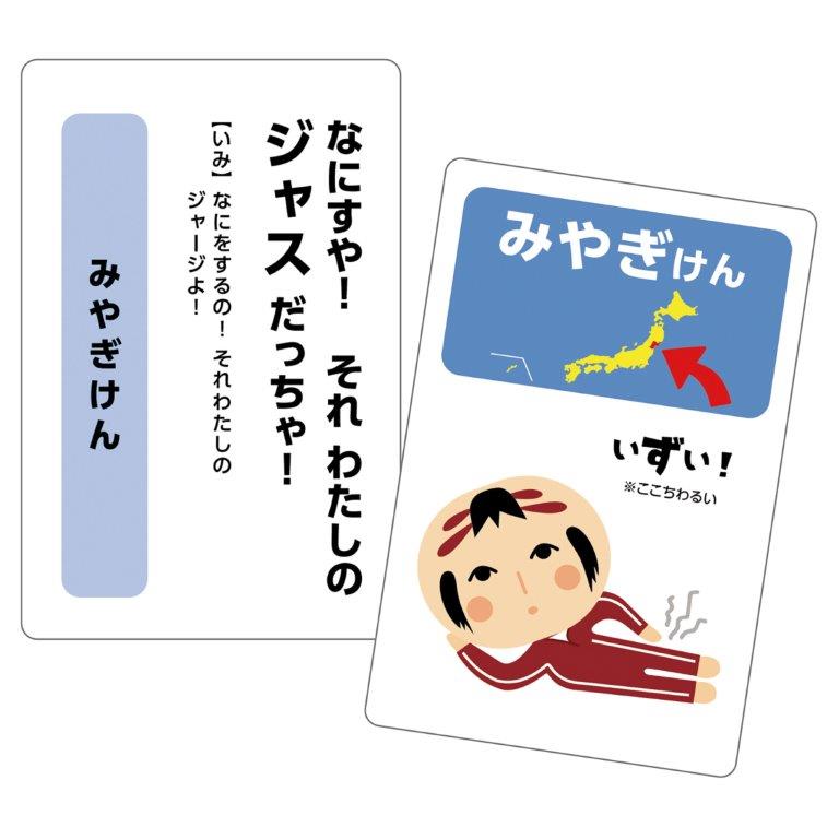 いちど口に出したらクセになる47都道府県の方言かるた! クセになる方言が盛りだくさんの楽しいかるたです。 読み上げられた方言を聞いて、それに合う都道府県を取るかるたです。 全国47都道府県すべての方言カードがあります。 |