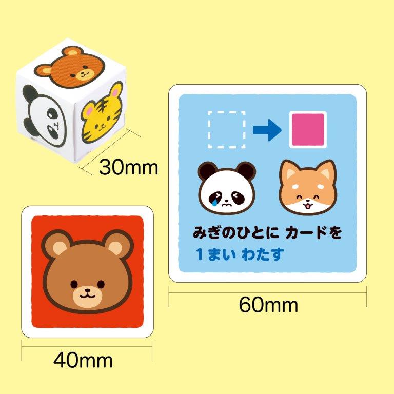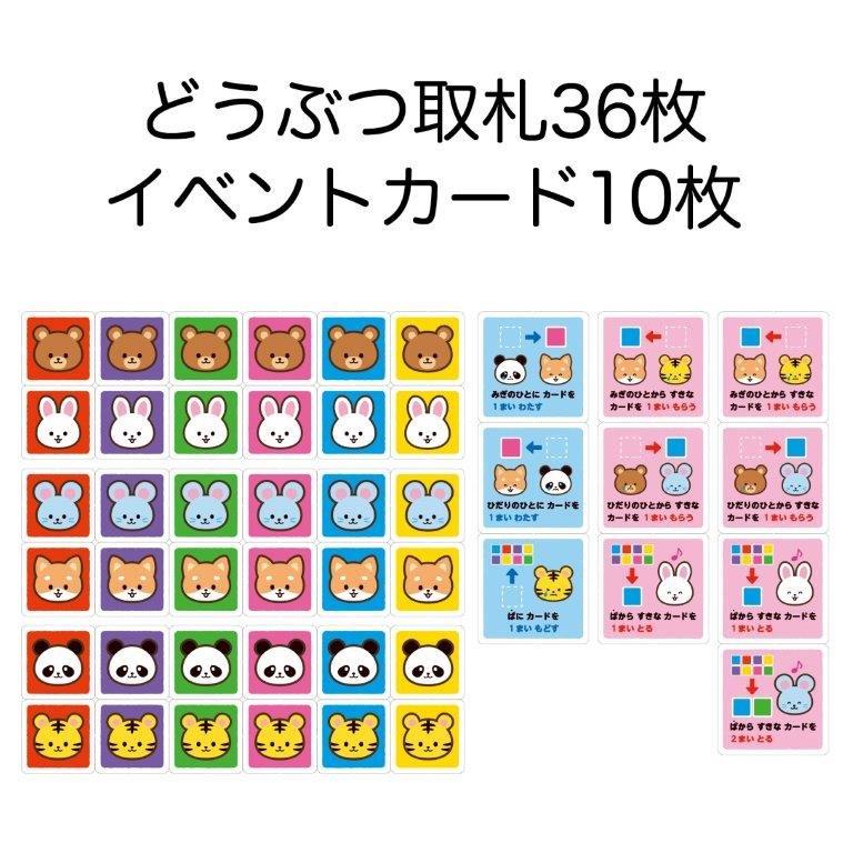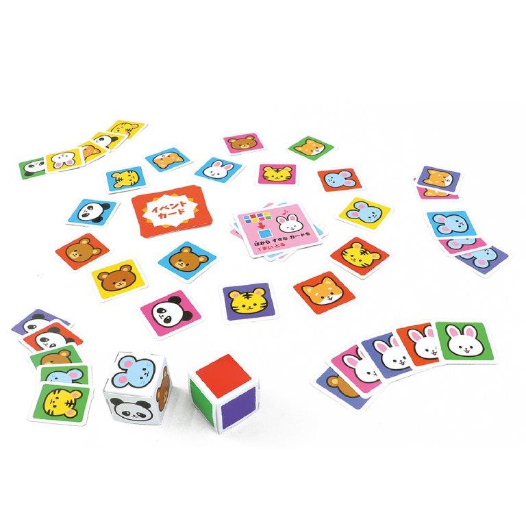 サイコロのいろとどうぶつからカードをさがそう! 読み札の代わりにサイコロを使うかるたです。 読み札がないので、文字が読めない小さなお子様でも楽しめます。 6種類のどうぶつと6つの色の組み合わせに合う取り札をもらえるゲームで、すでに盤面からそれに合うカードがなくなっている場合は、イベントカードを取ってその指示通りに動きます。 同じ色、同じ動物を4枚以上揃えると加算点があり、最終的に一番高い得点の人が勝利です。 |