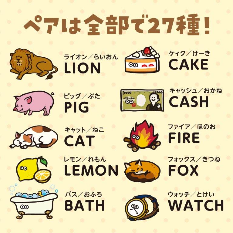 間違えちゃっても面白い!へんてこ合体が盛りだくさん! 楽しく英単語を学べるカードゲームです。 梅花女子大学こども教育学科とアーテックとの産学連携によるコラボ商品です。 まえカードとうしろカードの英語を合わせて単語をつくり、裏返したときにその単語に合ったイラストになったらカードをもらえます。 まえカードと組み合わて単語ができるうしろカードは複数パターンあるため、英単語を作っても、裏返すまでは単語とイラストが一致しているかは分からないという運要素も入ったカードゲームです。 裏返したらヘンテコないきものが現れるなど、カードがもらえなくても面白く楽しむことができます。 |
