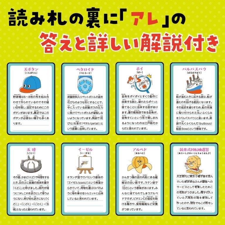 見たことあるけど、思い出せない「アレ」の名前!あなたはいくつわかる? お弁当によく入っている緑色の仕切りの「アレ」や金魚すくいのときに使う「アレ」など、世の中にあるけれど名前を知らないモノをテーマにしたおもしろいかるたです。 「アレ」の名前だけでなく、その「アレ」に関する豆知識の紹介も書かれています。 |