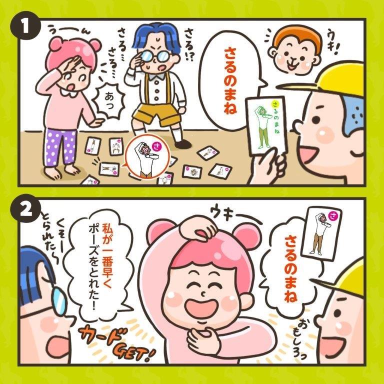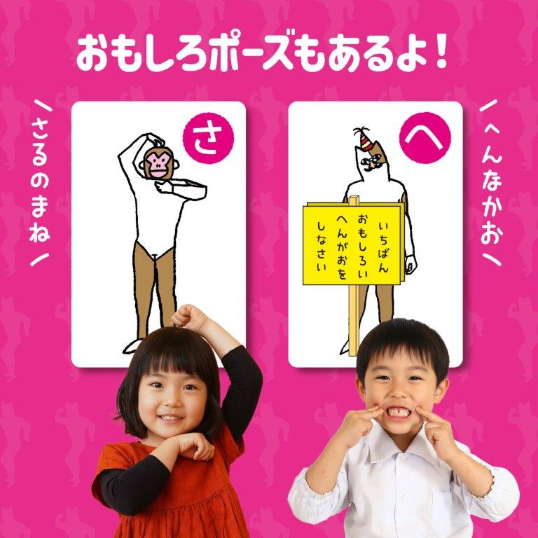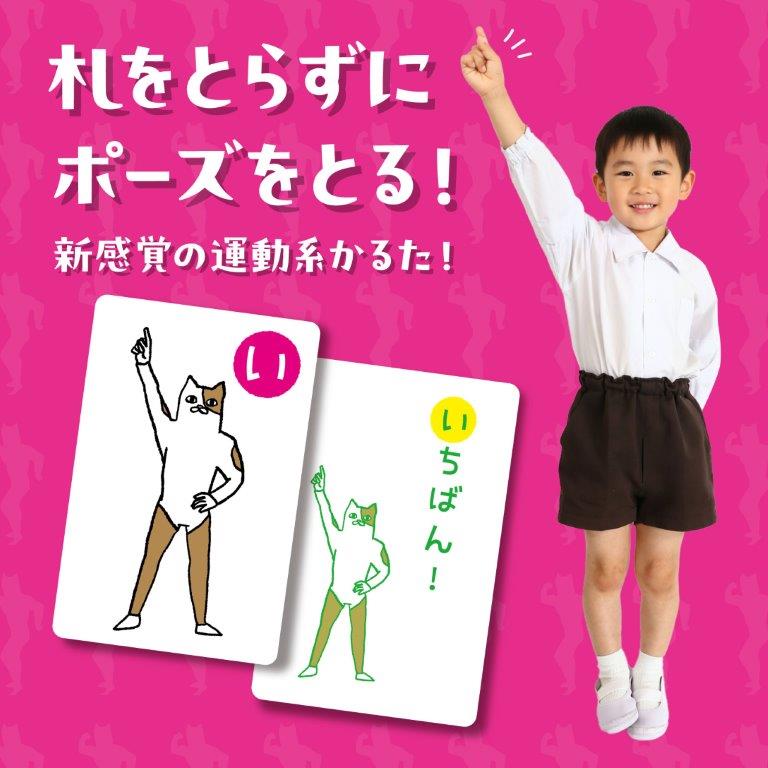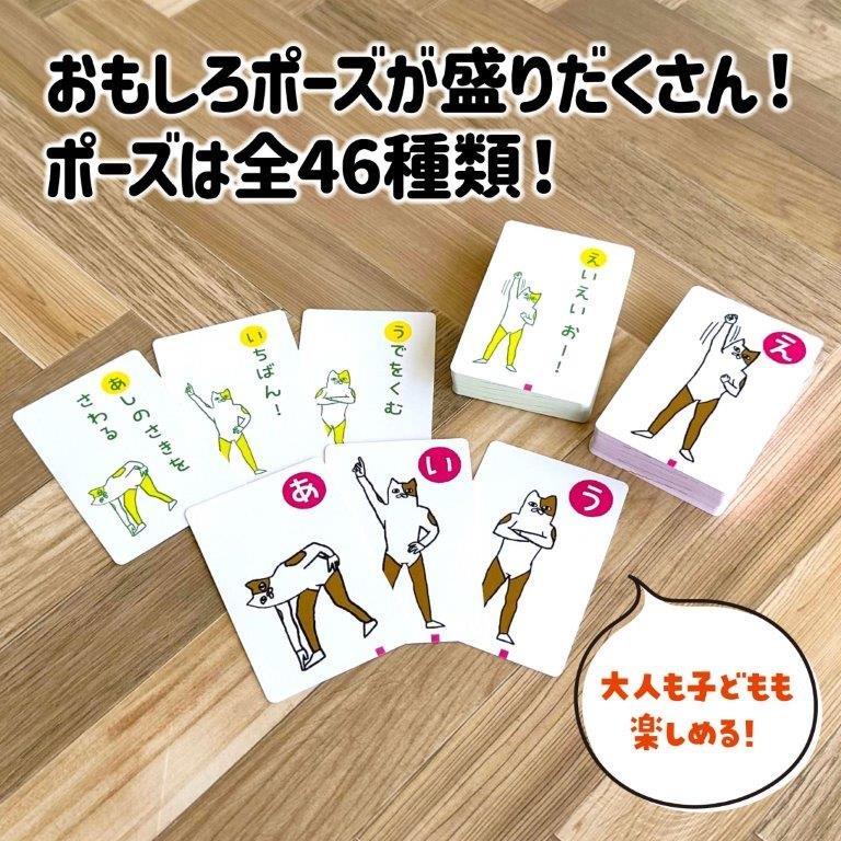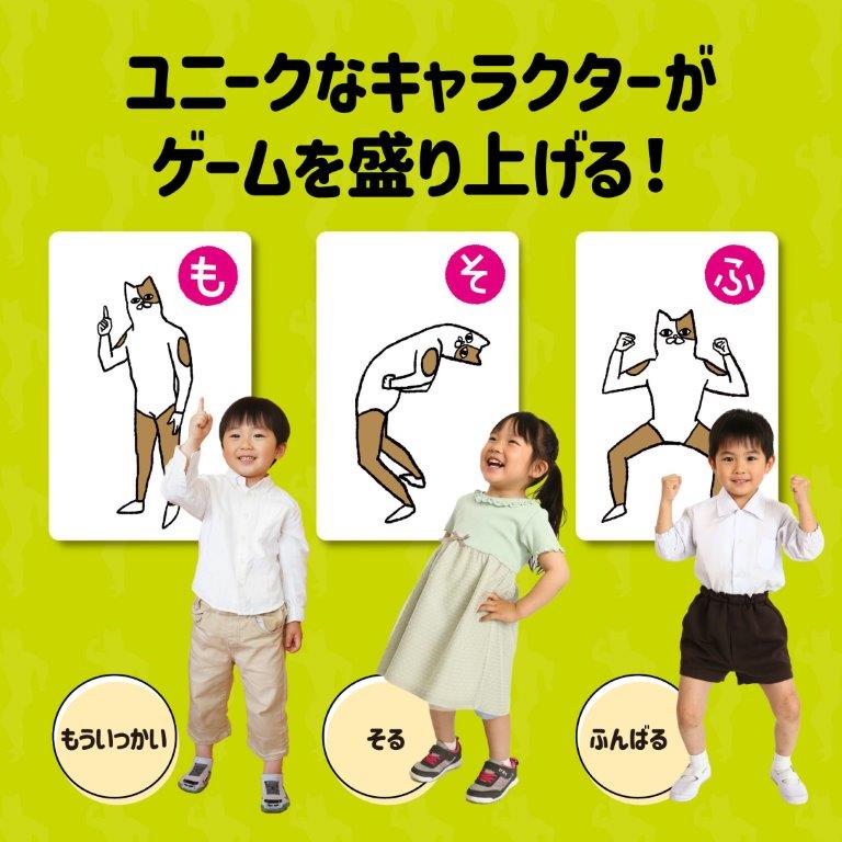 だれが一番早く同じポーズを取れるかな? かわいい猫のキャラクターとおもしろいポーズが盛りだくさんの楽しいかるたです。 読み札でポーズが読み上げられて、一番最初にそのポーズをした人が取り札をもらえます。 体の部位の名前を覚えたり、軽い室内運動をしたりするのにも良いゲームです。 |