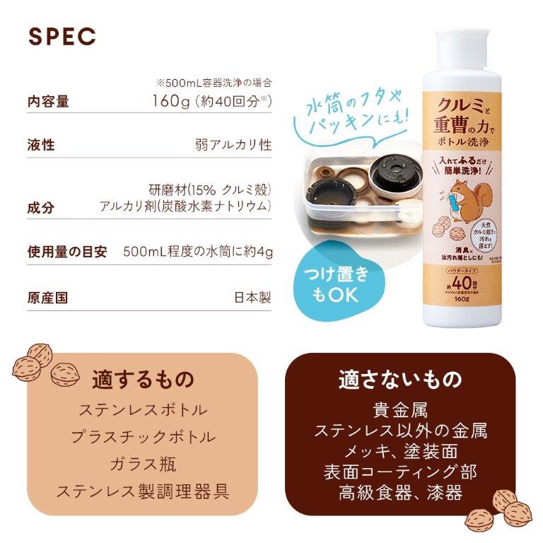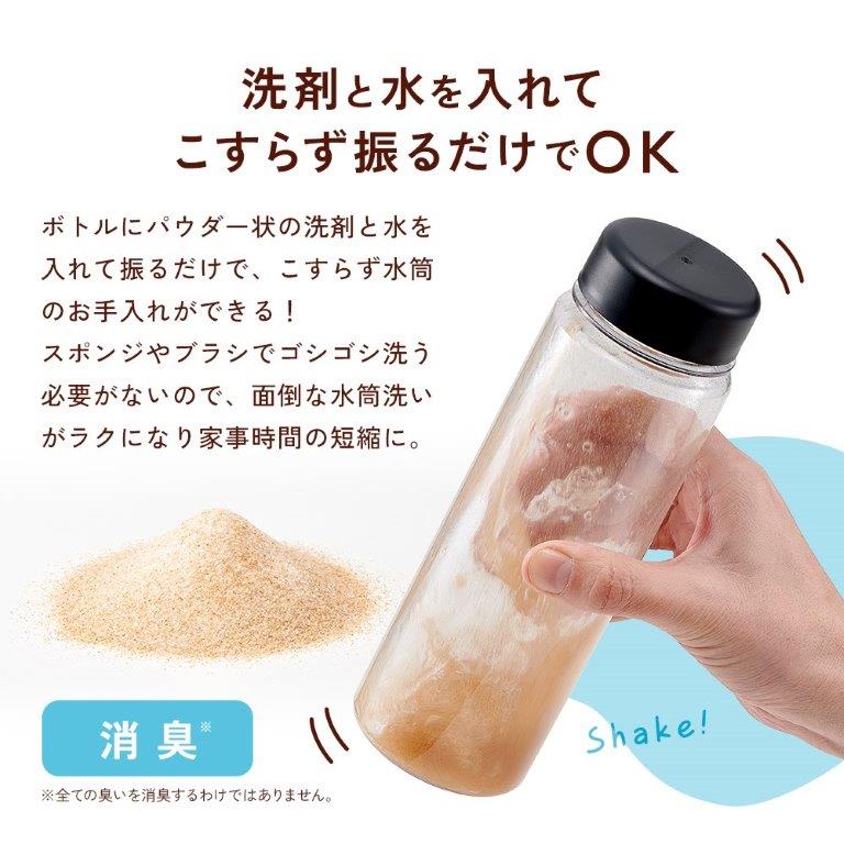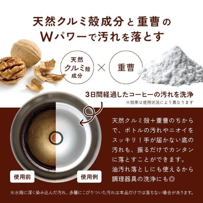 入れてふるだけで簡単洗浄! 天然クルミ殻成分で汚れを落として、ニオイも消臭します。 これ1本で500mL容器洗浄の場合(約)40回分使用できます。 水筒洗いだけでなく、調理器具の油汚れ落としにも。 パウダータイプ。 ※全ての臭いを消臭するわけではありません。 使用方法 〈水筒洗いの場合〉 ①500mL程度の水筒に対し本品を小さじ1杯弱(4g程度)を入れ、水筒全体の容量の1割程度の水を入れる。 ②水筒のフタを閉め、上下左右に約20回振る。 ③その後フタを開けて中身を出し、水でしっかりすすぎ洗いをする。 〈調理器具の油汚れ洗浄の場合〉 ※肌が弱い方は手袋をはめてから洗浄する。 ※鏡面仕上げやプラスチックなど傷つきやすいと思われる場所への洗浄は一度目立たない箇所で試してから使用する。 ①水に濡らした布やスポンジに本品をふりかけ、汚れた部分をよくこする。 ②その後、水でよくすすぐ。 |