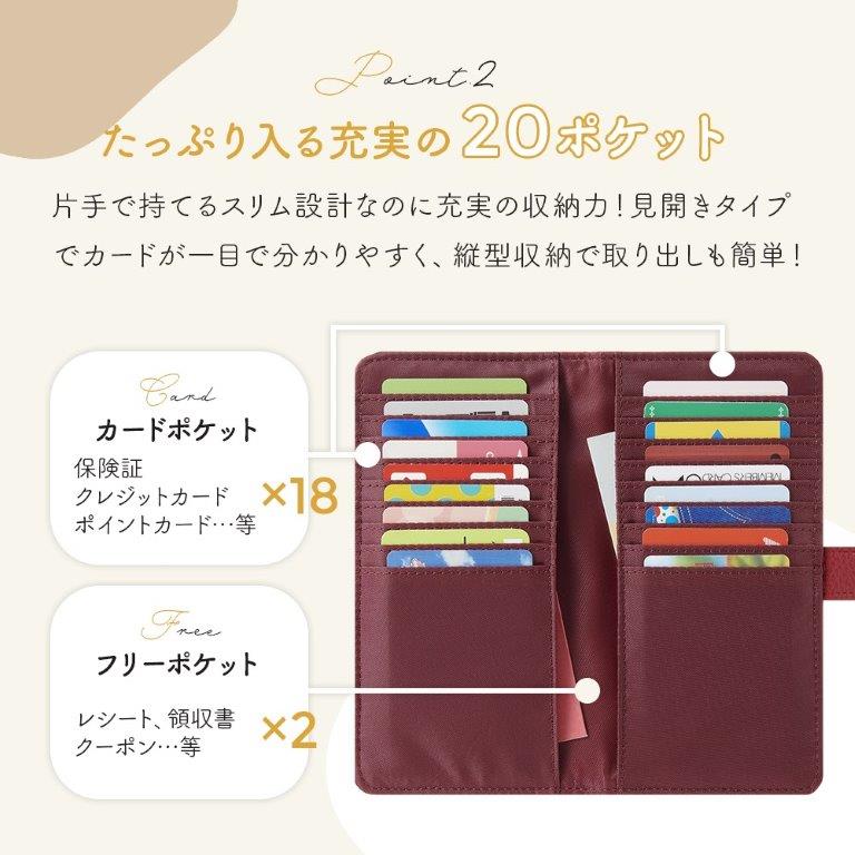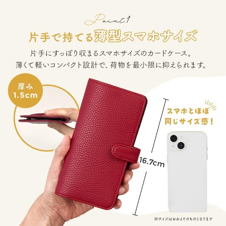片手で持ちやすいスマホサイズのカードケース。 コンパクトだからかばんの中でかさばりにくい! カードが見やすい見開きタイプで、カードを18枚収納できます。 レシートやクーポンなどを入れておけるフリーポケット2室付。 ■商品サイズ:閉じた状態/(約)10×16.7×1.5cm、開いた状態/(約)17.5×16.7×0.5cm(留め部含まず) ■収納枚数:18枚 |