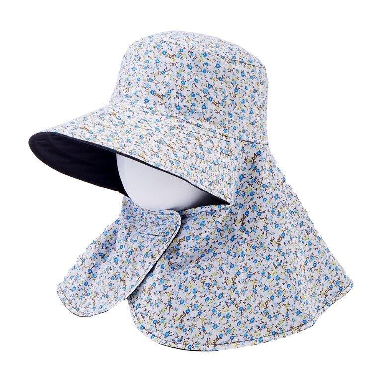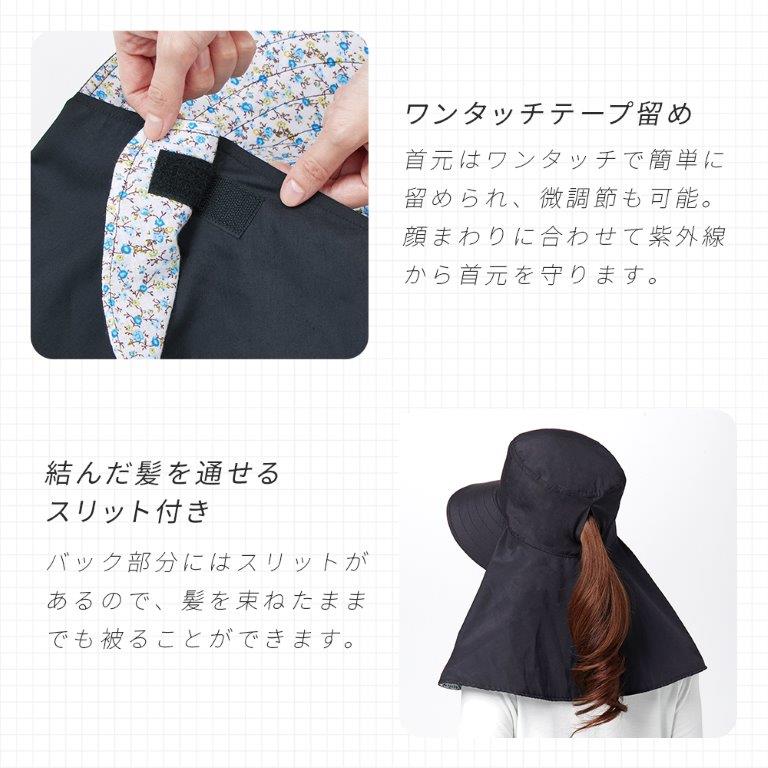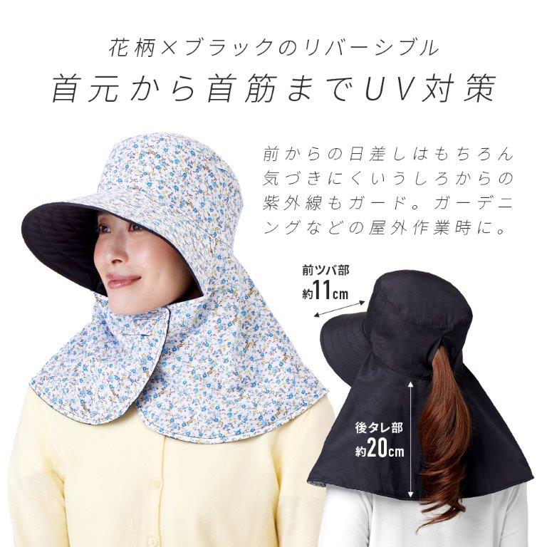 広めのツバで前からの日差しはもちろん、フラップ部が首もと・首すじの日差しもしっかりガード! ガーデニングやスポーツ観戦、アウトドアシーンに。 首もとはワンタッチテープで簡単に留められます。 片側はブラック、もう片側はおしゃれな花柄のリバーシブルタイプのデザイン。 後頭部には結んだ髪を通せるスリット付。 UVカット率99%以上。 手洗いOK。 ■UVカット率:99%以上 |