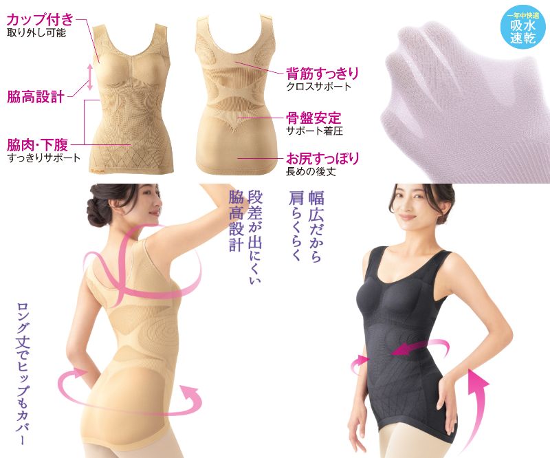 サイズ(約)/縦55×横29×高さ5cm 適応サイズ(約)/バスト 86~101cm 重量(約)/115g 着ている間、姿勢と骨盤をケアするソフトな着心地のサポートインナー。 ブラジャー+キャミソール+補整下着がこれ一枚で。 砂時計型シルエットが着用時の体のラインを滑らかに整えます。 段差が出にくい脇高設計でシルエットスッキリ。 全方向360°やさしく包み込んで苦しくない。 後下がりのロング丈でお尻まですっぽり。 伸縮性抜群、蒸れにくく吸水速乾性に優れた特殊繊維使用。 ※洗濯機可(洗濯ネット使用)(あて布使用) --------------------------- 【関連ワード】 補整下着 キャミソール 脇高設計 --------------------------- |
